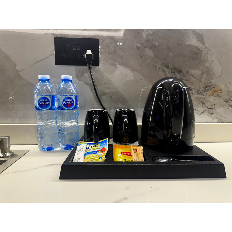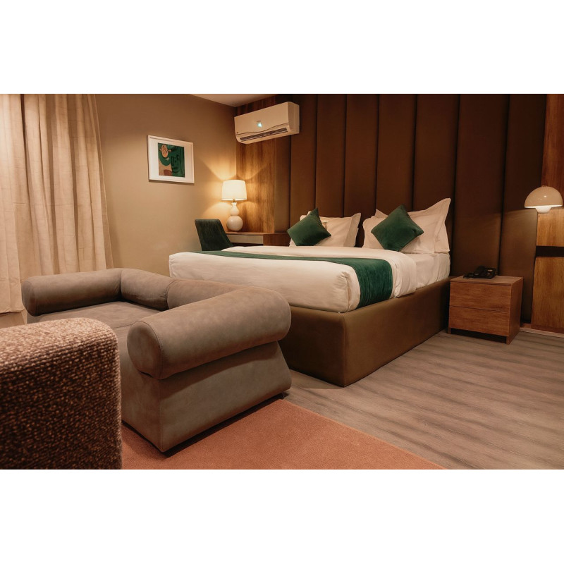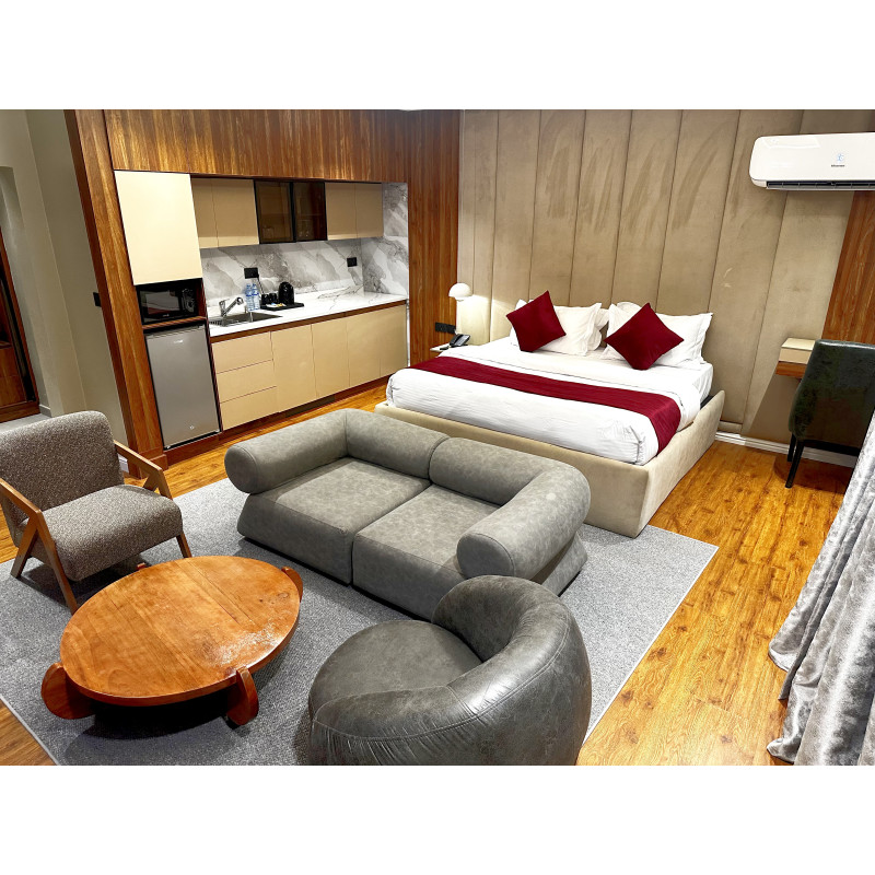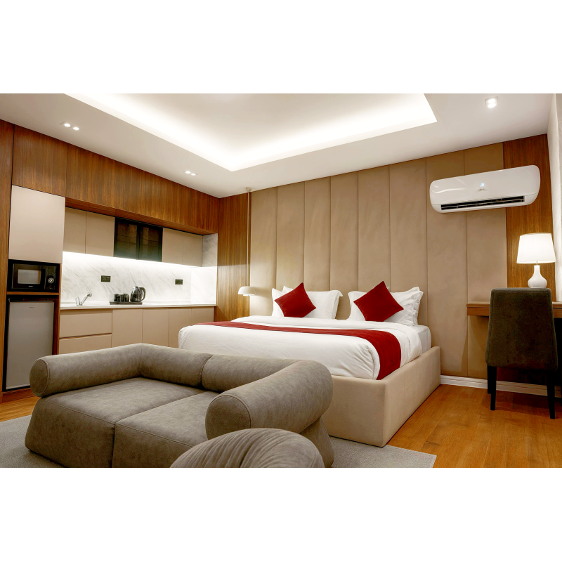 Luxurious, spacious room with a kitchenette, rainfall shower, walk-in closet, and a private balcony.
